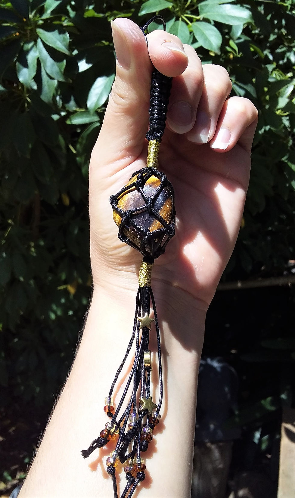 Your crystal is wrapped within a macrame net of coloured cord and highlighted with cotton thread, electoplated hematite stars and moon and small beads.